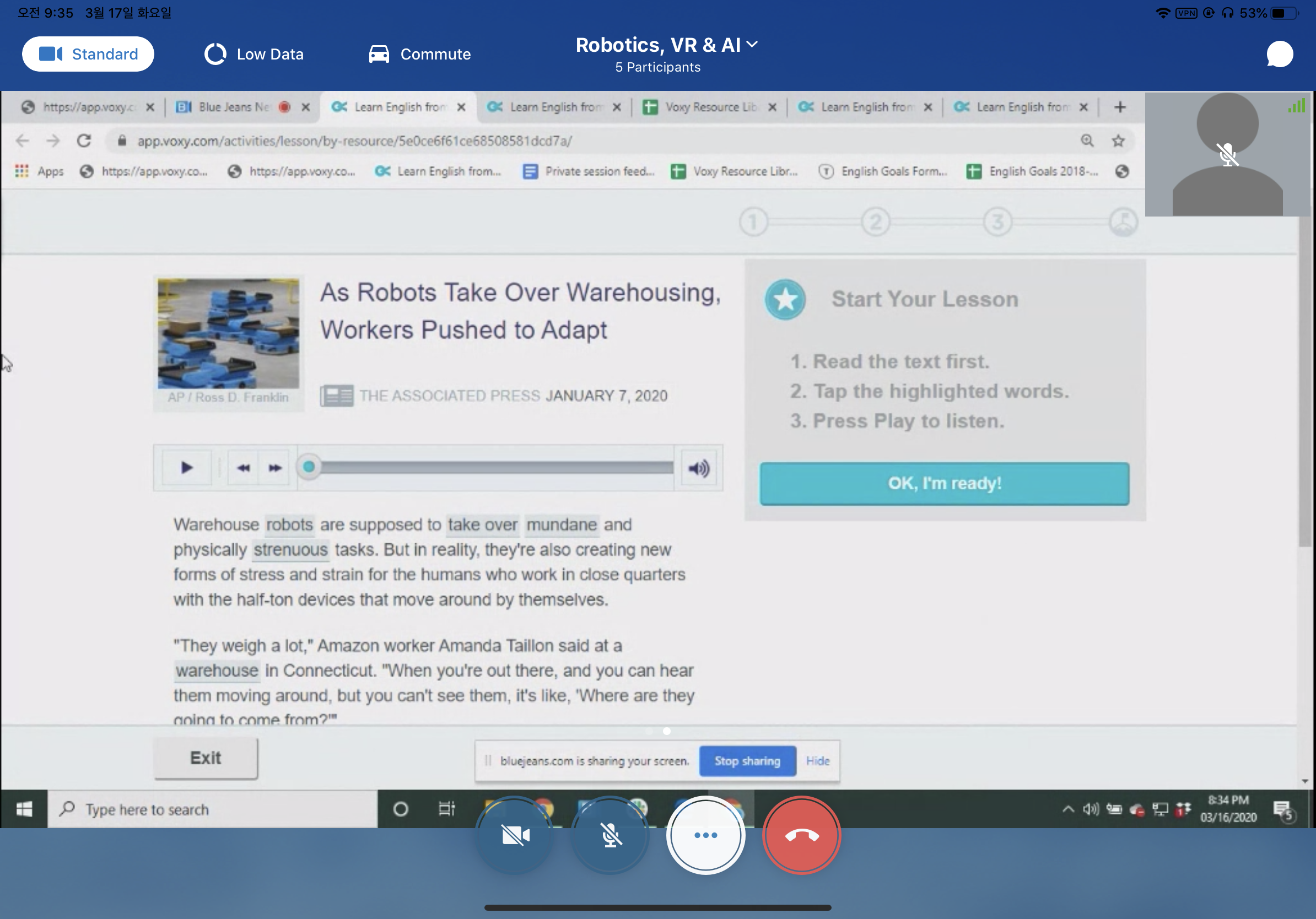 주제는 Robotics, VR & AI 였고 로봇이 할 수 있는 일에 대한 이야기로 레슨이 진행됐어요. 이번 레슨에선 몇 가지 단어를 새로 배웠어요.