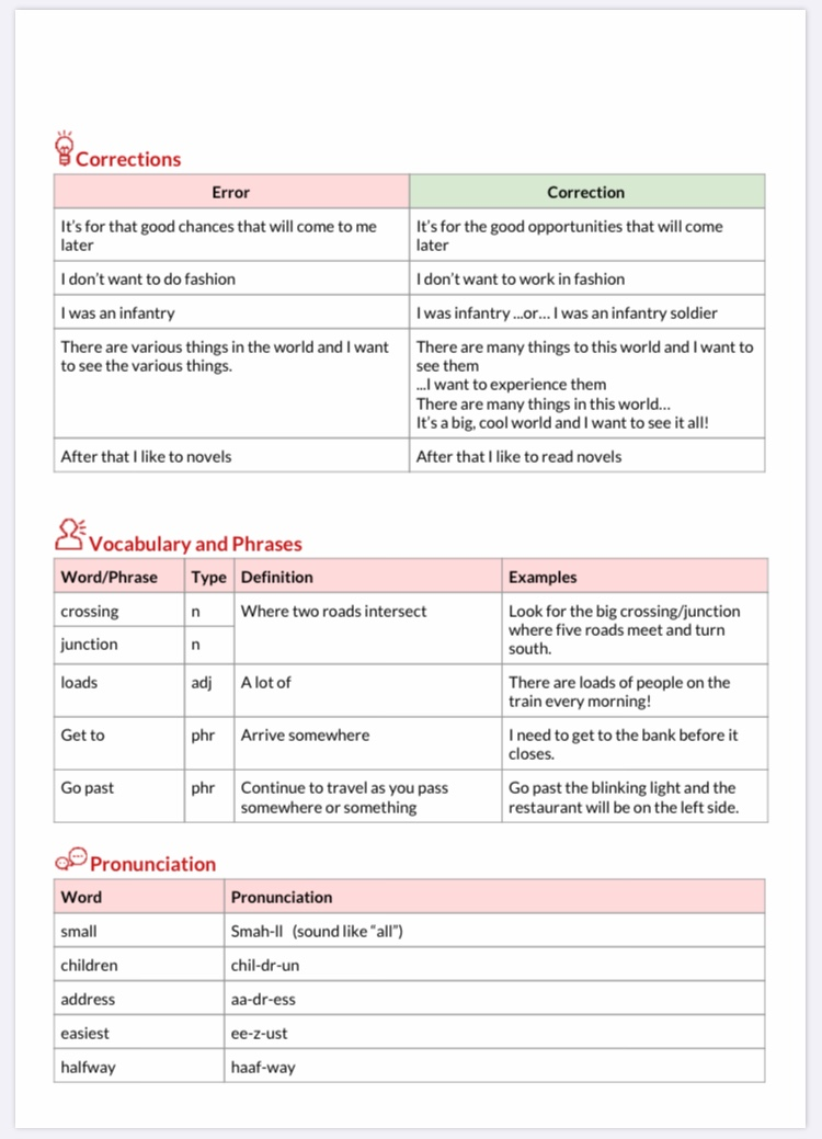 첫번째 레슨노트 내용이에요! 우선 Michael 쌤은 교재보단 편하게 이야기하면서 제가 영어로 말하는게 자연스럽게 느껴지도록 해주셨어요. 그리고 말하는 중간중간 잘못된 부분을 지적해주시거나, 더 나은 표현을 알려주시면서 레슨노트에 적게돼요. 저 같은 경우는 원래 문법은 좀 잘아는 편인데(한국식 영어 교육의... 수혜...?), 본인이 잘못된거 짚어서 여기 적어야 되는데 제가 잘 안틀려서 적을게 너무 없다면서 약간 힘들어 하시다가? 제가 틀리게 말하면 '오 하나 잡았다!' 이런 식으로 알려주셔서 재밌었어요 ㅋㅋㅋㅋ 그리고 너 다시 시험보면 분명 이거보다 높은 성적 받을거라고 해주셔서 조금 기분이 좋았다...ㅎㅎ